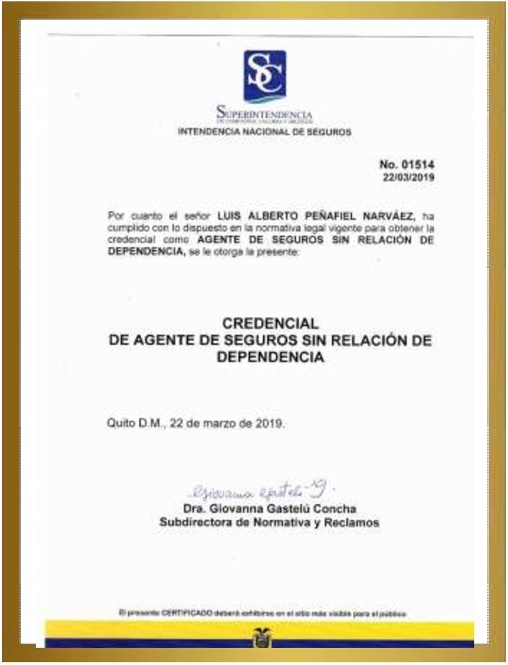 Contamos con la credencial “Nº 01514” otorgada por la SUPERINTENDENCIA DE COMPAÑIAS SEGUROS Y VALORES, somos una compañía de aptitud que indica el cumplimiento de los requisitos de idoneidad, avance, capacidad y experiencia que califica nuestro desempeño profesional.
